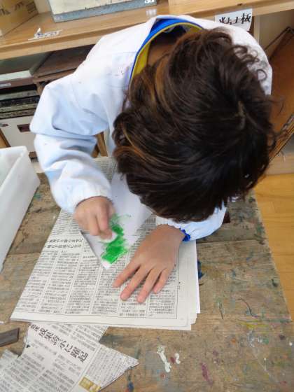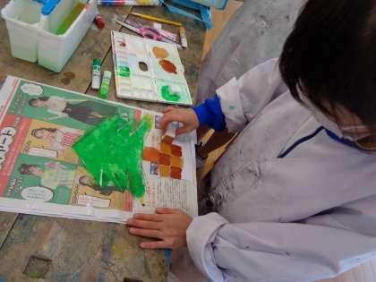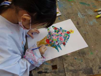 もうすぐクリスマスということで、『ポンポン クリスマスツリー』を描きました。ツリーの形にくりぬいた新聞紙を画用紙の上に重ね、絵の具を含ませたスポンジでポンポンと叩きました。「スポンジを使うと、なんか本物の木みたいな模様になる!」と、気づいたことを話しながら楽しく取り組んでいました。