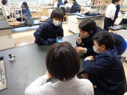 理科の学習で、水の温まり方について実験をして、調べました。インクの色が変わっていく様子を真剣に観察していました。