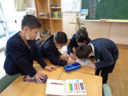 学級活動の時間に、ぬり絵伝言ゲームをしました。