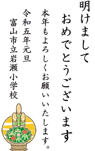 明けまして、おめでとうございます 公開日 2023/01/04 更新日 2023/01/04 学校紹介 令和5年も、岩瀬っ子の様子を発信していきます。 本年も、本校ホームページをどうぞよろしくお願いいたします。