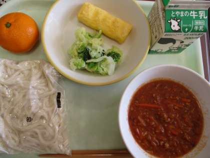今日の献立は、ソフト麺、牛乳、ソフト麺のミートソース、たまごロール、グリーンサラダ、みかんです。学校給食はとても美味しいです。