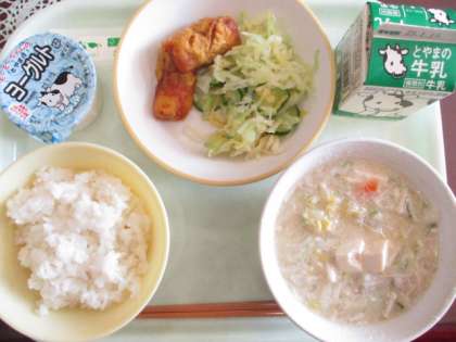 今日の献立は、ご飯、牛乳、ちくわのカレー揚げ、あわせ和え、豆乳汁、ヨーグルトです。豆乳汁には白菜やねぎなどの野菜がたくさん入っていて美味しかったです。