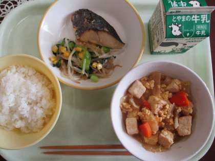 今日の献立は、ご飯、牛乳、鰆の西京焼き、コーンあえ、厚揚げの錦とじです。美味しくいただきました。