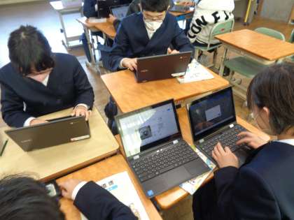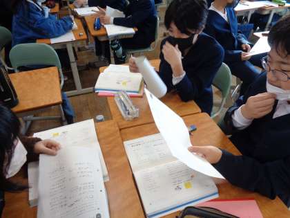 家庭科の時間には、冬休みの宿題をグループの友達に発表しました。「おいしそう」「1人で作ったん?」と話しながら、コメントを書き合いました。