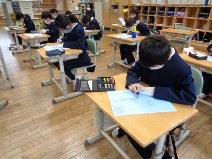 今日は、初めて彫刻刀を使って板を彫りました。安全に学習を進めるための約束や用具の特徴について話を聞いた後、早速彫刻刀を使ってみました。