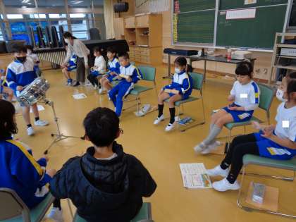 「かぼちゃ」の授業が終わりました。くじ引きで決めた楽器を使って、決められたパートを演奏します。演奏する人が増えるにつれて、大きくなっていく音の響きを楽しんでいました。
