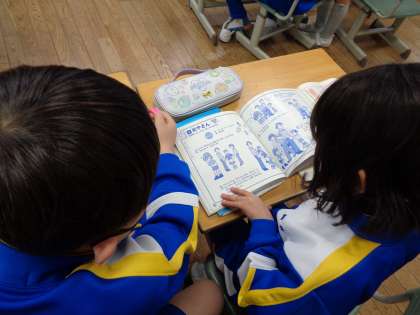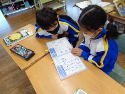 「おにごっこ」の授業では、本で遊び方を調べて説明文を書く活動に入りました。今日は、図書館で遊びについての本を借り、おもしろそうな遊びに付箋を貼りました。次の授業では、見つけた遊びについての説明文を書いていきます。