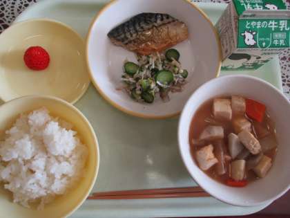 ご飯、牛乳、さばの塩焼き、えのきの梅肉和え、のっぺい、いちごです。