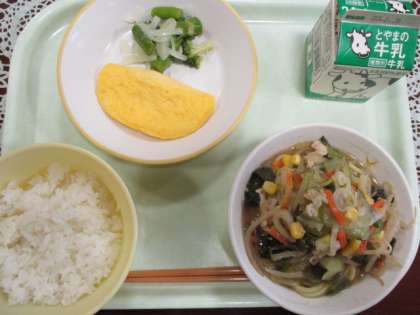 給食週間2日目です。今日の献立は、「おはなしりょうり教室 こまったさん」のお話からの献立です。こまったさんのオムレツ、魔女のフレンチサラダ、行列ができるこまったさんのラーメンです。こまったさんシリーズで、こまったさんが作った料理や料理を作るシーンをもとにした献立になっています。
