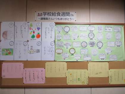 廊下には、給食カルタや給食あいうえお作文、調理員さんへのメッセージが掲示されています。みんな給食が大好きです。