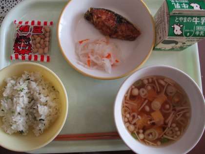今日の献立は、菜めし、牛乳、魚のかば焼き、なます、すまし汁、節分豆です。2月3日は節分ですね。