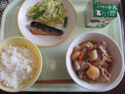 2月になりました。今日の献立は、ごはん、牛乳、いわしのおろし煮、野菜ソテー、豚肉とじゃがいものうま煮です。