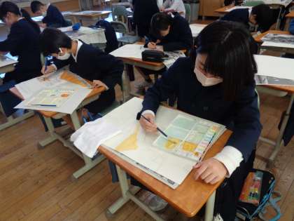 卒業式に歌う歌を聴きながら、校舎の絵の下書きと色塗りをしています。思い出を振り返りながら、素敵な作品になるといいですね。