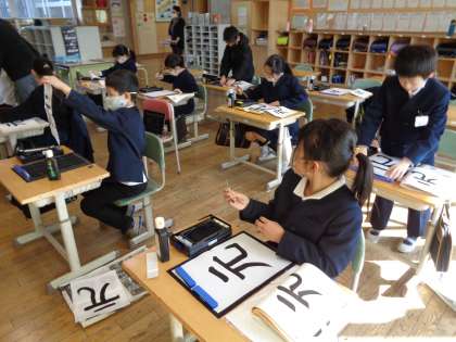 書写の時間には、「曲がり」を使った「元」という字を書きました。