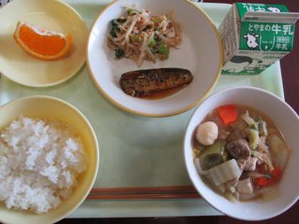 今日の献立は、ごはん、牛乳、ちゃんこ鍋、いわしのピリ辛煮、いり大豆あえ、いよかんです。いよかんの美味しい季節になりました。