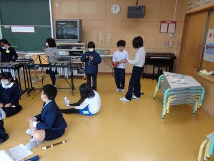 音楽の学習で色々な楽器を使った合奏をしました。木琴や鉄琴、リコーダーなど色々な楽器に分かれて演奏しました。練習の成果が伝わる素敵な演奏でした。