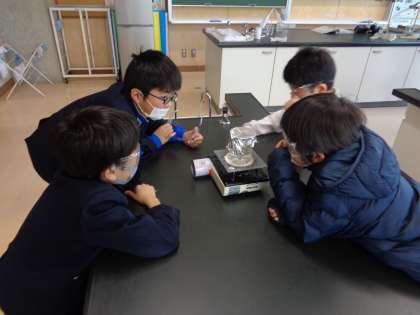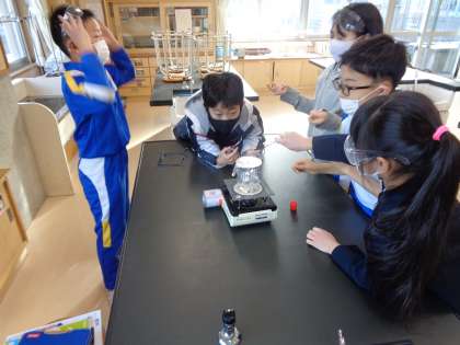 理科の学習で水を沸騰させたときに出る湯気や泡の正体を実験で調べました。湯気がスプーンにつく様子や泡が袋の中に入っていく様子をよく観察していました。