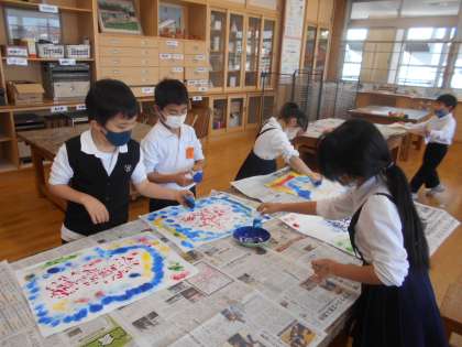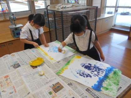 生き物を刷った紙の背景に、たんぽを使って色づけをしました。