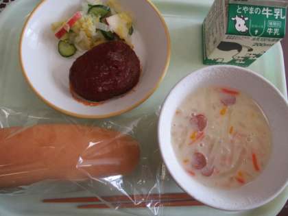 今日の献立は、コッペパン、牛乳、ハンバーグのケチャップ煮、白菜とりんごのサラダ、コーンチャウダーです。