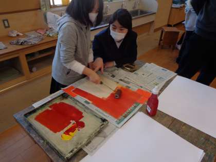 図画工作の学習で版画をしました。彫刻刀で彫った木版にインクをつけ、紙に刷りました。友達とも協力して楽しそうに作る姿が見られました。
