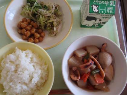 今日の献立は、ごはん、牛乳、フライビーンズ、ゆかりあえ、いかと里芋の煮物です。美味しくいただきました。