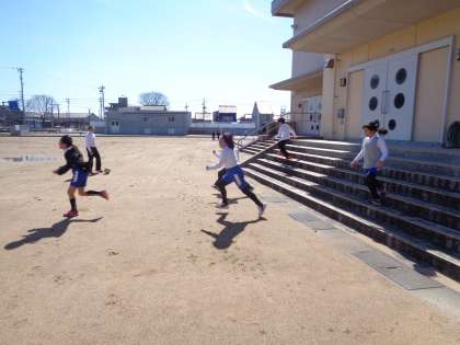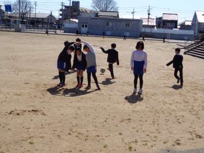 今日は天候もよかったので、子供たちは「みんなで遊ぼうよ!」と誘い合って外へ出ました。鬼ごっことサッカーに意見が分かれたので、「サッカー鬼ごっこ」という遊びを考えてやってみることにしました。