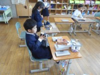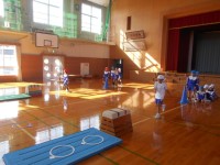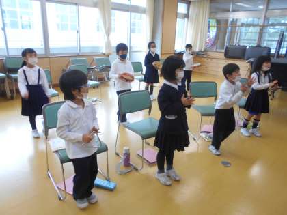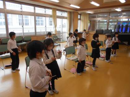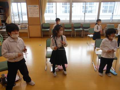 「子犬のマーチ」の曲のリズムに合わせて すず、タンバリン、トライアングル、カスタネットを使って合奏をしました。