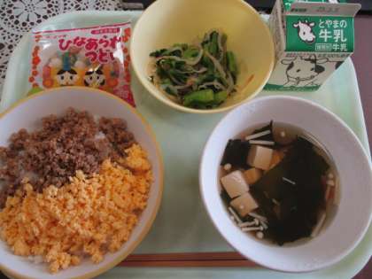 今日の献立は、ひな祭り献立です。そぼろ丼、なばなひたし、すまし汁、ひなあられ、牛乳です。献立も春満開です。