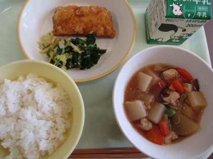 今日の献立は、ごはん、牛乳、揚げ魚のレモン味、こんぶ和え、大和煮です。