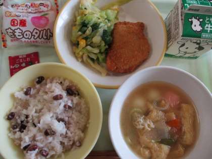 今日は卒業する6年生をお祝いする「卒業お祝い給食」です。赤飯、牛乳、とんかつ、コーンあえ、紅白しらたま汁、桃のタルト、ごま塩です。