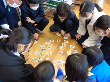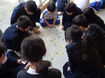 5年生の企画で1年生とかるた大会をしました。白熱している班もあれば、1年生の様子を温かく見守る班もありました。