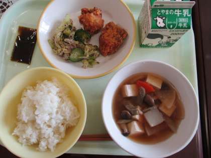 今日の献立は、ご飯、牛乳、鶏肉の竜田揚げ、ゆかりあえ、けんちん汁、のり佃煮です。