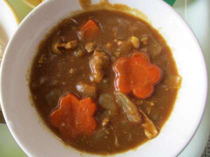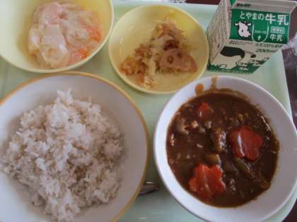 今日の献立は、麦ごはん、牛乳、カレーライス、福神和え、フルーツヨーグルトです。カレーのにんじんが可愛い花の形になっていました。給食で春を感じることができました。
