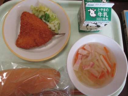 今日の献立は、コッペパン、牛乳、あじフライ、アスパラサラダ、ポテトスープです。大きなあじフライでした。
