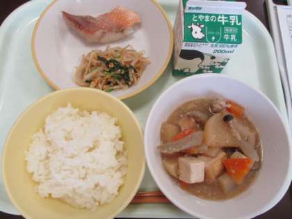 今日の献立は、ごはん、牛乳、赤魚の塩焼き、いり大豆和え、鶏肉と根菜のごま煮です。