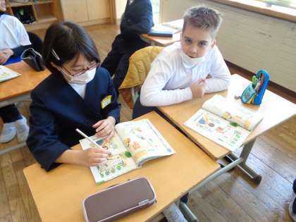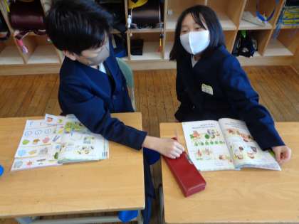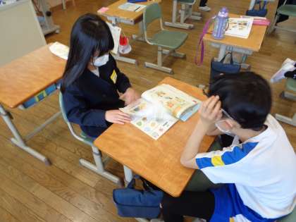 今日の外国語活動では、自分の1日を英語で友達に紹介しました。朝起きる時間や起きてからすることなど、教科書に書かれた英語を使って友達と話しました。