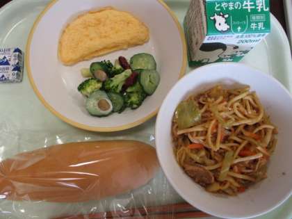 今日の献立は、コッペパン、牛乳、焼きそば、オムレツ、ビーンズサラダ、ポケットチーズです。
