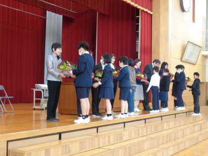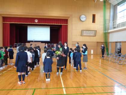 今日の離任式では、今までお世話になった先生方、職員の方々に感謝を伝えることができました。児童代表の言葉とともに花束を渡し、笑顔でお別れのひとときを過ごしました。