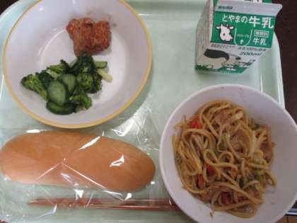 今日の献立は、子供たちが大好きな焼きそばです。ショウガの風味が効いていて美味しいです。その他の献立は、牛乳、コッペパン、照り焼きチキン、えごまドレッシングサラダです。