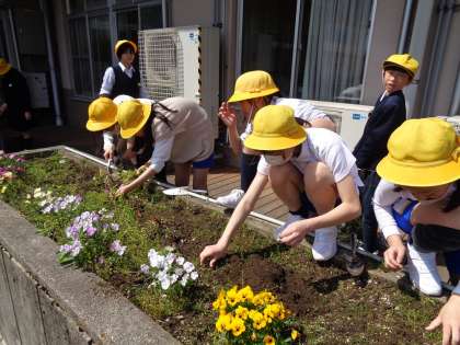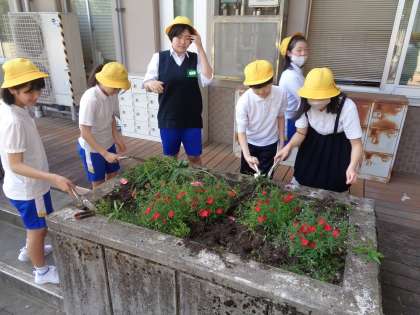 チューリップが散り始めたため、学年の花壇の整備を行いました。雑草を抜いたり、散った花びらを拾ったりして、次の花壇活動のための環境を整えました。