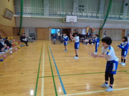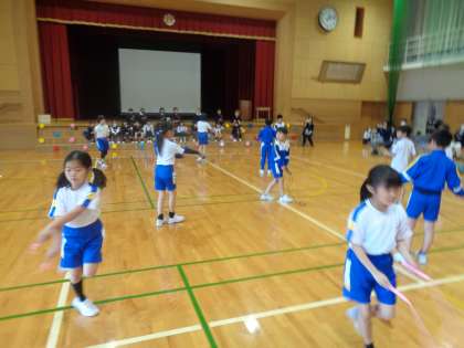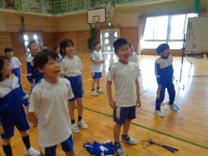 入学おめでとう集会で、リズムなわとびをしました。1年生におめでとうの気持ちがつたわるように真剣に行っていました。