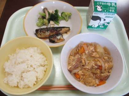 今日の献立は、ごはん、牛乳、いわしのピリ辛煮、ブロッコリーときのこのソテー、卵とじです。
