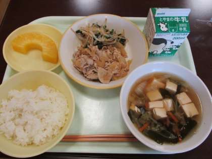 今日の献立は、ごはん、牛乳、豚肉の生姜焼き、ナムル、中華スープ、パインアップルです。