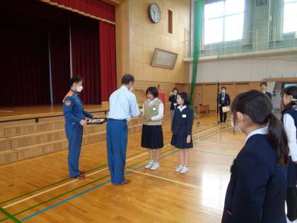 今日は6年生の子供たち19名が、地域の消防署の署員の方々から、B・F・Cバッジを受け取りました。地域の防火・防災への貢献を誓う子供たちでした。