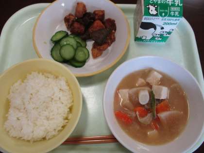 今日の献立は、ごはん、牛乳、豚肉とレバーの揚げからめ、きゅうりもみ、ごまけんちんです。