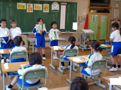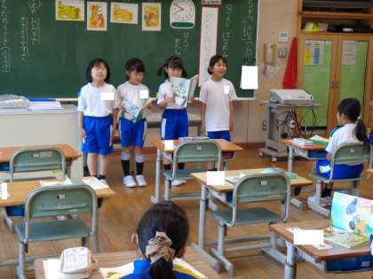 教科書をしっかり持ち、姿勢正しく発表する子供や、文章を覚えて身振り手振りを加えて発表する子供等、思い思いに発表していました。