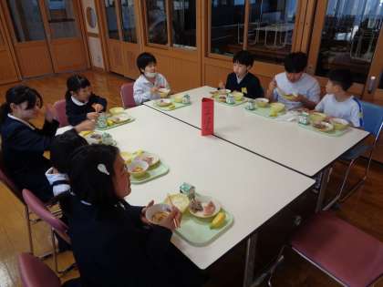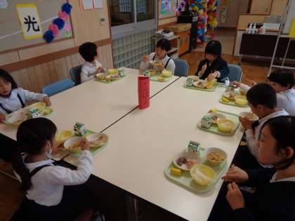 今日から、団ごとにランチルームに集まって給食を食べる「団結ランチ」が始まりました。1日目は赤団でした。どの班も、会話を楽しみながら食事をしたり、スポーツフェスティバルで頑張りたいことを発表し合ったりしながら過ごしていました。