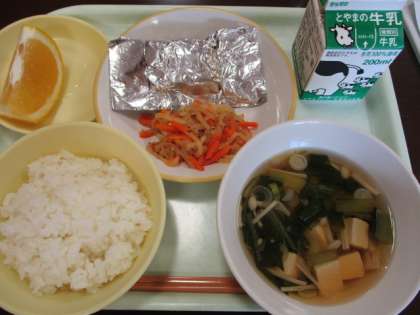 今日の献立は、ごはん、牛乳、さばの銀紙焼き、大根のきんぴら、すまし汁、河内晩柑です。さばの銀紙焼きは味噌がとても美味しく、ごはんに付けて食べてもおいしいです。