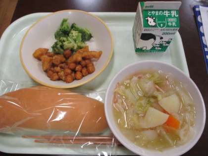 今日の献立は、米粉コッペパン、牛乳、鶏肉とひよこ豆のカレー風味、ゆでブロッコリー、野菜のスープ煮です。野菜たっぷりのスープがとてもおいしかったです。