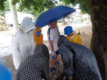 雨が降る中、子供たちは一生懸命ゴミ拾いに取り組みました。大切な場所を自分たちの手で美しくし、子供たちはとても満足そうでした。